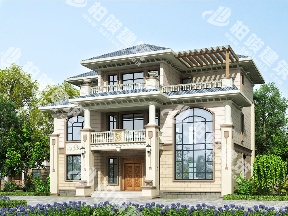 屋顶设计:蓝色釉面瓷瓦铺设坡形屋顶,大气美观