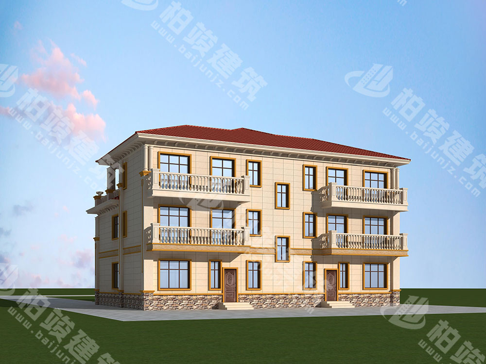 屋顶造型:坡屋顶设计,多个立面高低起伏,错落有致;红色釉面瓷瓦色泽鲜丽,经久耐用