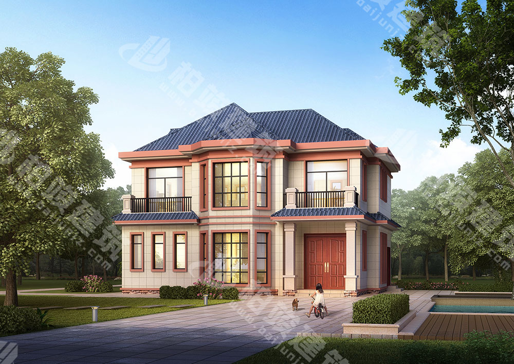 屋顶造型:平坡结合,灰蓝色瓦片铺设错落坡顶,平顶处可放置水箱,美观实用兼而有之